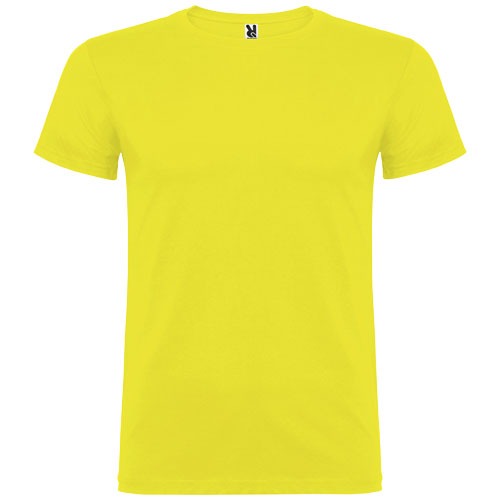 Kurzärmeliges T-Shirt mit doppellagigem Rundhalsausschnitt aus Elasthan, hergestellt aus schlauchförmigem Material für Erwachsene. Verstärkte und verdeckte Nähte am Kragen. Herausnehmbares Etikett. Das Modell ist 190 cm groß und trägt Größe L.