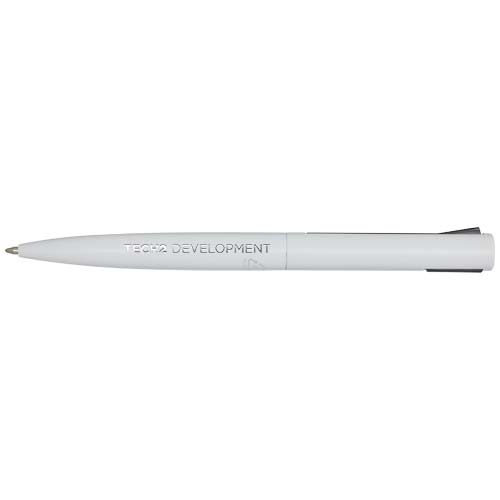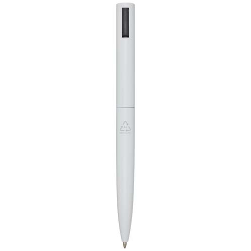 Kugelschreiber, dessen oberer Schaft aus recyceltem Kunststoff und dessen unterer Teil aus recyceltem Aluminium besteht. Der Clip besteht aus Eisen. Tintenfarbe: Blau. Schreiblänge: 1000 Meter. Strichstärke: 1,0 mm.