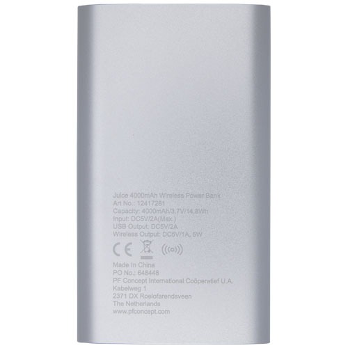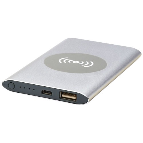4000 mAh Powerbank mit Aluminiumgehäuse. Unterstützt kabelloses Laden mit 5 W und wird auch mit Mikro-USB-Ausgang geliefert, um das Aufladen per Kabel zu ermöglichen. Mit dem 4000 mAh Lithium-Polymer-Akku kann ein Smartphone vollständig aufgeladen werden. Leistungsanzeige, die jederzeit den Energiepegel anzeigt. Mikro-USB-Anschluss: 5 V/2 A Ausgang: 5 V/2A. Kabelloser Ausgang 5 W. Inklusive PVC-freiem TPE Kunststoff Ladekabel. Lieferung in einer Standard-Geschenkbox.