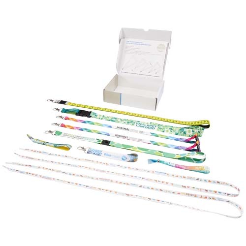 Musterbox Sublimation Lanyards enthält 2 Festivalarmbänder, 1 Paar Schnürsenkel, 1 Mini-Lanyard, 1 1-Meter Lanyard, 1 Lois RPET-Lanyard mit Sicherheitsschnalle, 1 Bucks Lanyard, 1 Addie Lanyard und 1 Addie RPET-Lanyard. Hergestellt in Europa.