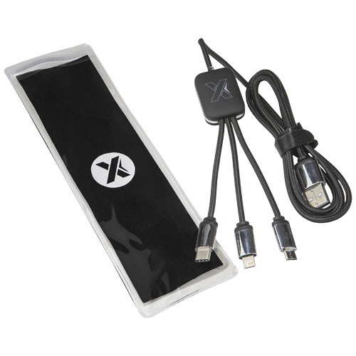 Beleuchtetes Logo-Ladekabel mit Gummi- und Metalloberfläche, ausgestattet mit drei Steckern (Typ-C, Android, iPhone). Es können bis zu drei Geräte gleichzeitig aufgeladen werden. Länge der Kabel (einschließlich Stecker): 10 cm. Gesamtlänge des Kabels: 1 Meter. Kabel aus recyceltem PET-Kunststoff und die Verpackung besteht aus recyceltem Papier und recyceltem Kunststoff.