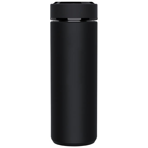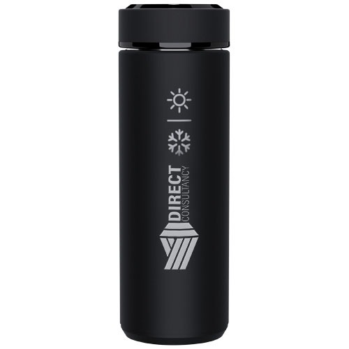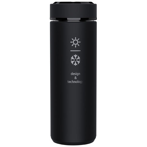 Doppelwandige, isolierte 450 ml Edelstahlflasche mit einem Temperatursensor. Dank des „Touch & Light“-Systems wird die Temperatur des Getränks auf dem Flaschendeckel angezeigt (in Celsius). Sowohl für heiße als auch für kalte Getränke geeignet. Wird in einer zylindrischen Geschenkbox aus Recyclingpapier geliefert. Größe: Ø 47 x 225 mm. Inklusive Batterie: CR 2450 (3V). Die Batterie kann nicht ausgetauscht werden. Kann die Temperatur 20.000 Mal anzeigen.