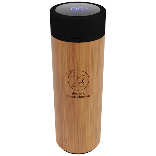Doppelwandige, vakuumisolierte Flasche aus Edelstahl und Bambus mit einem Temperatursensor oben auf dem Deckel, der die Temperatur des Getränks in der Flasche anzeigt (Grad Celsius). Hält Getränke 8 Stunden lang heiß oder 12 Stunden lang kalt. Wird mit einem Teefilter geliefert. Fassungsvermögen: 500 ml. Wird in einem Geschenkkarton geliefert.