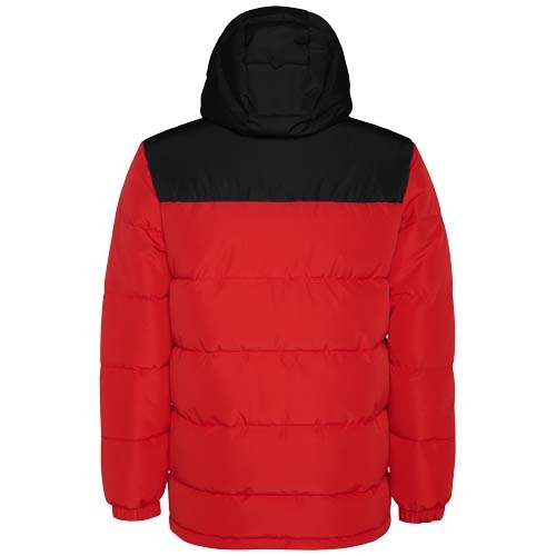 Wattierte Jacke mit fester Kapuze. Reißverschluss auf der Vorderseite, verdeckt durch eine Knopfleiste. Kinnschutz. Zwei Seitentaschen mit Reißverschluss. Elastische Bündchen.