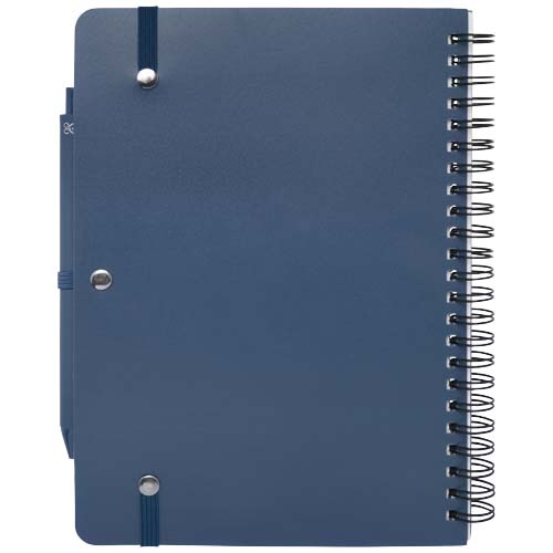 Das Thalaasa A5 Hardcover Notizbuch besteht aus recyceltem ozeangebundenem Kunststoff und umfasst 80 Blatt, liniert, aus cremefarbenem 70 g/m² Papier. Das Notizbuch hat abgerundete Ecken. Es ist mit einem elastischen Verschluss und einer Stiftschlaufe ausgestattet. Der Kugelschreiber mit schwarzer Tinte ist ebenfalls aus recyceltem, ozeangebundenem Kunststoff hergestellt. Schreiblänge: 1000 Meter. Schreibspitze: 1 mm.